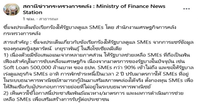 สศค.ยืนยันออกหลายมาตรการดูแลเอสเอ็มอี ทั้งพักชำระหนี้ เงินกู้ดอกเบี้ยต่ำ ค้ำประกันสินเชื่อ