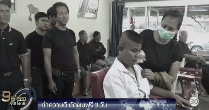 ช่างผมกว่า 10 คน ของชมรมช่างตัดผม อ.นาโยง จ.ตรัง กราบพระบรมฉายาลักษณ์ พระบาทสมเด็จพระปรมินทรมหาภูมิพลอดุลยเดช ก่อนเริ่มให้บริการตัดผมฟรี 3 วัน