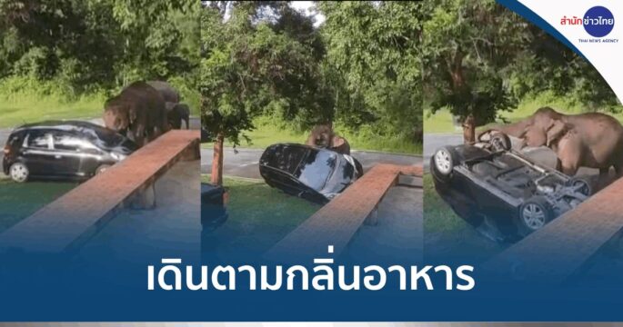 ระทึกช้างป่าเขาใหญ่พลิกรถนักท่องเที่ยวหงายท้อง เจ้าหน้าที่เผยช้างเดินตามกลิ่นอาหารจากรถ และพยายามพลิกรถค้นหา