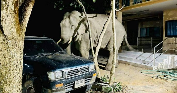 “พลายบุญช่วย” ช้างป่าละอูที่เคยบุกครัว เมื่อคืนนี้ออกจากป่ามาขโมยกินอาหารแมวหมดถุง ล่าสุดเจ้าหน้าที่อุทยานแห่งชาติแก่งกระจานมาตามให้กลับเข้าป่าไปแล้ว