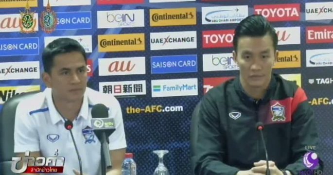 โค้ชซิโก้ หัวหน้าโค้ชทีมฟุตบอลทีมชาติไทย และสินทวีชัย ผู้รักษาประตูร่วมการแถลงข่าวก่อนเกมฟุตบอลโลก 2018 รอบคัดเลือก โซนเอเชียรอบ 12 ทีมสุดท้าย