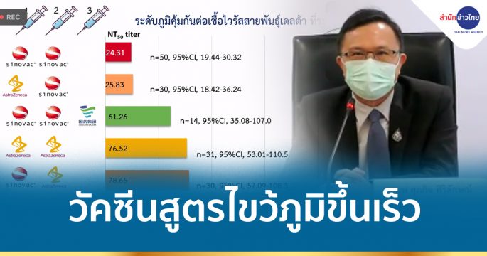 กรมวิทย์แจงผลศึกษาทดลองประสิทธิภาพสูตรฉีดวัคซีนกับสายพันธุ์เดลตา ในห้องปฏิบัติการระดับ 3 พบวัคซีนไขว้สลับชนิดให้ผลดีสุด และภูมิขึ้นเร็ว เพียง 5 สัปดาห์ รองลงมาแอสตราฯ 2 เข็ม ส่วนการฉีดแบบบูสเตอร์ แอสตราฯ เป็นเข็ม 3 หลังรับซิโนแวค พบให้ผลดีเช่นกัน แต่ไม่สนับสนุนฉีดแอสตราฯ เข็ม 1 และซิโนแวค เข็ม 2
