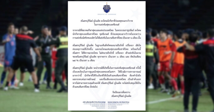 บุรีรัมย์ ยูไนเต็ด ประกาศลงโทษซ้ำ สั่งแบน “ธีรภักดิ์” ยาว 6 เดือน พร้อมตัดเงินเดือน 25% เซ่นปมวิวาทนัดชิงฟุตบอลซีเกมส์