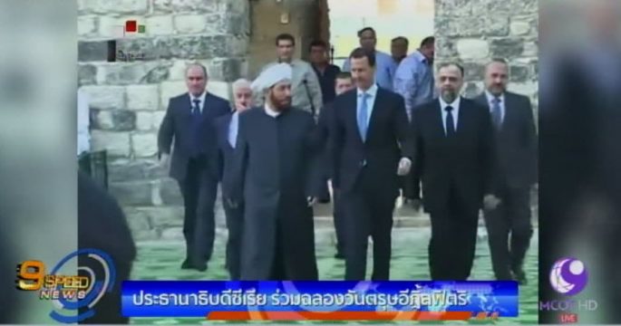 โทรทัศน์ซีเรียแพร่ภาพประธานาธิบดีบาชาร์ อัล อัสซาด ของซีเรีย ร่วมพิธีฉลองวันตรุษอีฎิ้ลฟิตริ กับอิหม่ามและครูสอนศาสนา รวมทั้งผู้แสวงบุญในสุเหร่ากลางเมืองฮามา