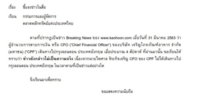 CPF ชี้แจง “ไพศาล จิระกิจเจริญ” ซีเอฟโอ ไม่ได้ร่วมทริปปิดดีลซื้อโลตัสที่อังกฤษ
