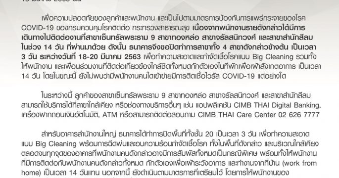 ซีไอเอ็มบีไทยแจ้งปิดสาขาเซ็นทรัลพระราม 9 ทองหล่อ จรัลสนิทวงศ์ และสำนักสีลม หลังพบพนักงานติดโควิด 1 คน