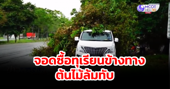 หนุ่มมาเลย์อยากกินทุเรียน แวะซื้อริมถนน ลมพัดต้นไม้ล้มทับรถยนต์