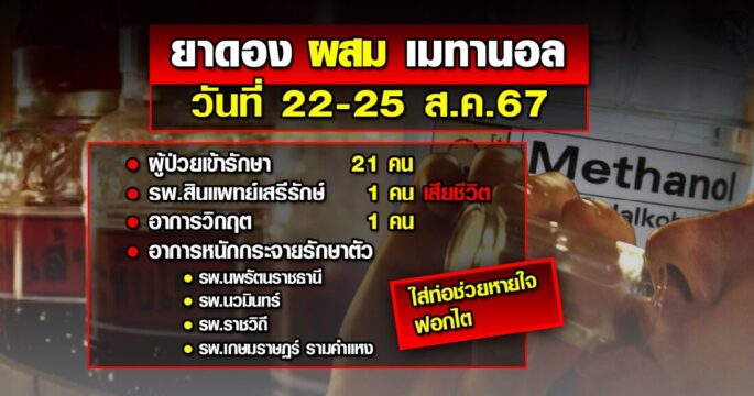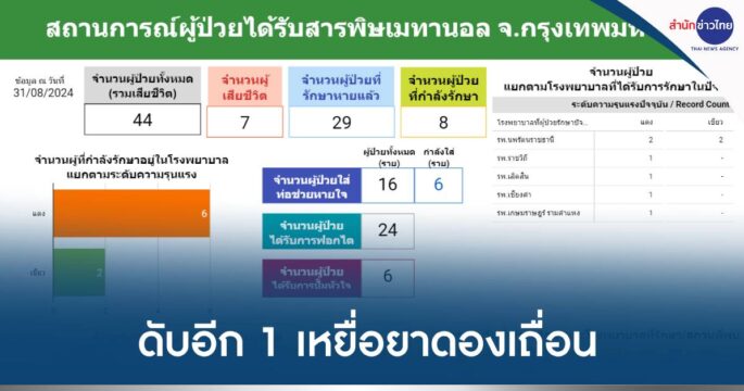 เสียชีวิตเพิ่ม 1 ราย เหยื่อยาดองเถื่อน รวมเสียชีวิตแล้ว 7 ราย และพบผู้ป่วยอีก 1 ราย รวมเป็น 44 ราย ซื้อจากซุ้มหทัยราษฎร์ 33 กลับไปพะเยา ดื่มครั้งสุดท้าย 28 ส.ค.