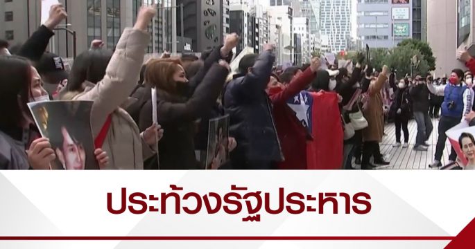 ผู้ประท้วงรวมตัวชุมนุมในกรุงโตเกียว หลังกองทัพเมียนมาทำการรัฐประหารและกักบริเวณนางออง ซาน ซูจี