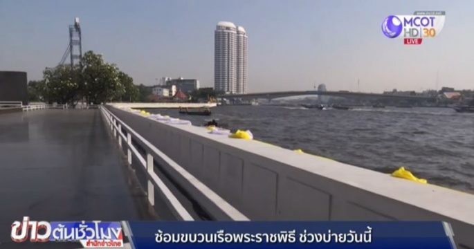 เจ้าหน้าที่จัดเตรียมสถานที่รองรับประชาชนที่จะเดินทางมาชมการซ้อมใหญ่เสมือนจริง ขบวนพยุหยาตราทางชลมารค บริเวณท่าเรือรถไฟ โรงพยาบาลศิริราช
