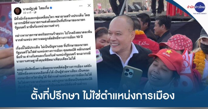 “ณัฐวุฒิ” แจงหลังมีนักร้อง-กลุ่มเคลื่อนไหว ยื่นสอบนายกฯ ขัดจริยธรรมร้ายแรง ยัน นายกฯ ตั้งเป็นที่ปรึกษา ไม่ใช่ตำแหน่งทางการเมืองเทียบเคียง “อดีตนายกฯ เศรษฐา” ตั้ง “พิชิต” ไม่ได้