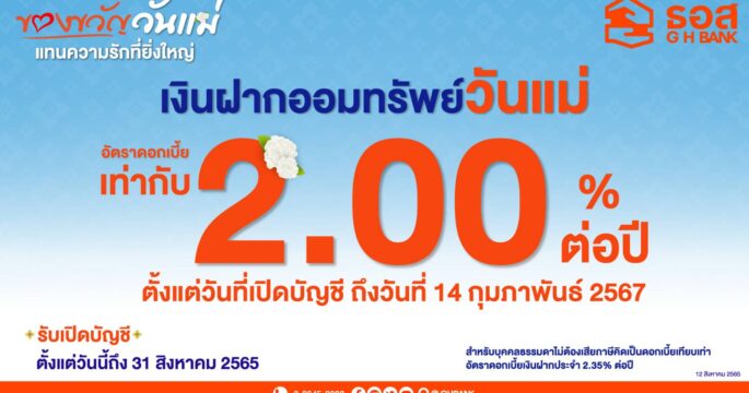 ธอส. ชวนประชาชนออมเงินรับวันแม่ เปิดตัว “เงินฝากออมทรัพย์วันแม่” ให้อัตราดอกเบี้ยสูงถึง 2.00% ต่อปี ตั้งแต่วันที่เปิดบัญชีถึงวันที่ 14 ก.พ.2567 บุคคลธรรมดาได้รับการยกเว้นภาษี เพียงเปิดบัญชีเงินฝากขั้นต่ำ 10,000 บาท ตั้งแต่วันนี้ถึง 31 ส.ค.65