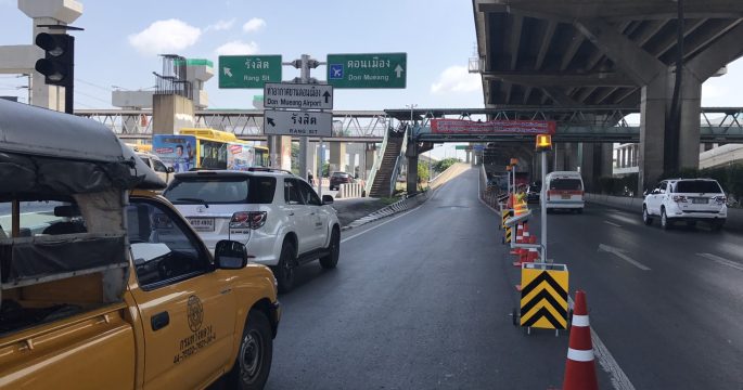 บรรยากาศทดลองปิดสะพานยกระดับเข้าสนามบินดอนเมืองวันแรก พบว่าไม่ส่งผลต่อการจราจรบน ถ.วิภาวดีฯ