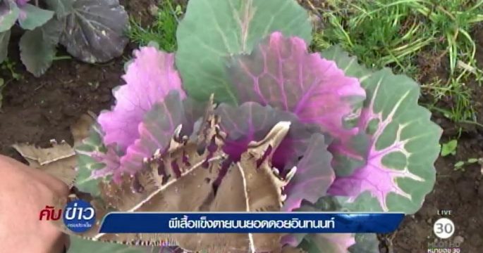 สภาพอากาศที่หนาวเย็นทำให้ฝูงผีเสื้อป่าหายากสีน้ำตาล หนีความหนาวเย็นมาหาไออุ่นซุกตามพื้นดินและต้นกะหล่ำปลี บริเวณหน้าสถานีรายงานกองทัพอากาศ บนยอดดอยอินทนนท์ บางตัวแข็งตาย