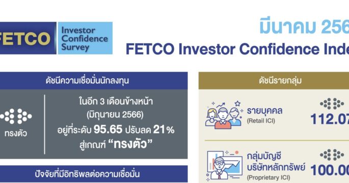 กรุงเทพฯ 10 เม.ย.- ดัชนีความเชื่อมั่นนักลงทุน (FETCO Investor Confidence Index: ICI) 3 เดือนข้างหน้าลดลง 21.0% นักลงทุนคาดหวังปัจจัยหนุนจากการเลือกตั้งและเฟดชะลอขึ้นดอกเบี้ย ปัจจัยฉุดคือ เงินไหลออกและนโยบายสกัดเงินเฟ้อของเฟด