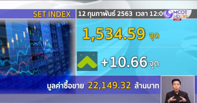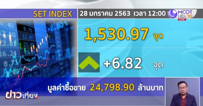 หุ้นไทยเช้านี้แกว่งแคบๆ นักลงทุนยังวิตกหุ้นเกี่ยวข้องจีน รวมทั้งกังวลงบฯ ปี 63 ล่าช้า ขณะที่ตลาดหุ้นในภูมิภาคเอเชียที่เปิดทำการติดลบถึง 2% ดัชนีช่วงเที่ยงอยู่ที่ 1,530.97 จุด เพิ่มขึ้น 6.82 จุด มูลค่าซื้อขาย 24,798.90 ล้านบาท