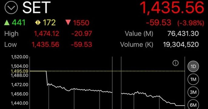 ตลาดหลักทรัพย์ปิดวันนี้ที่ระดับ 1,435.56 จุด ลดลง 59.53 จุด (-3.98%) มูลค่าการซื้อขาย 76,431.30 ล้านบาท