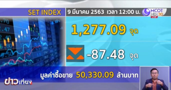 ดัชนีหุ้นไทยช่วงเช้าดิ่งหนักเกือบ 100 จุด ก่อนดีดกลับขึ้นมาได้เล็กน้อยในช่วงเที่ยง ติดลบ 87.48 จุด อยู่ที่ 1,277.09 จุด มูลค่าการซื้อขาย 50,330.09 ล้านบาท ขณะที่ราคาทองคำผันผวน ปรับราคาไปแล้ว 8 รอบ ล่าสุด ลดไปบาทละ 100 บาท