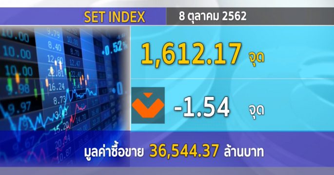 ดัชนีตลาดหลักทรัพย์ฯ ปิดวันนี้ (8 ต.ค.) ที่ระดับ 1,612.17 จุด ลดลง 1.54 จุด มูลค่าการซื้อขาย 36,544.37 ล้านบาท สวนทางตลาดภูมิภาค จับตาเจรจาการค้าสัปดาห์นี้