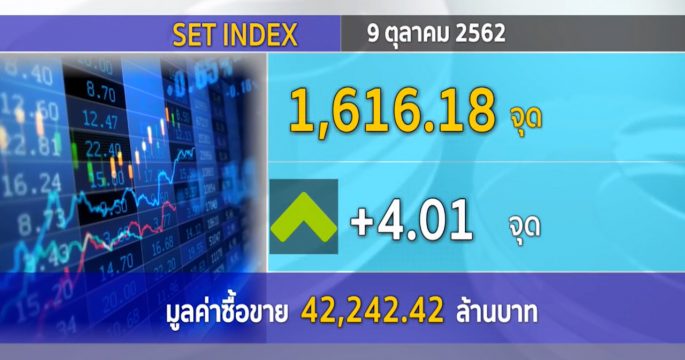 ดัชนีตลาดหลักทรัพย์ฯ ปิดวันนี้ (9 ต.ค.) ที่ระดับ 1,616.18 จุด เพิ่มขึ้น 4.01 จุด มูลค่าการซื้อขาย 42,242.42 ล้านบาท ดัชนีเคลื่อนไหวแดนบวก-ลบ ลุ้นวอลุ่มฟื้นจาก AWC เข้าเทรดพรุ่งนี้
