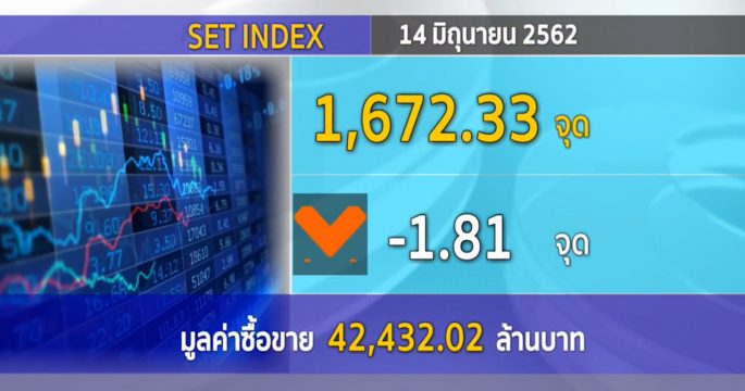 ดัชนีหุ้นไทยวันนี้ (14 มิ.ย.) ปิดลบ 1.81 จุด อยู่ที่ 1,672.33 จุด มูลค่าการซื้อขาย 42,432.02 ล้านบาท