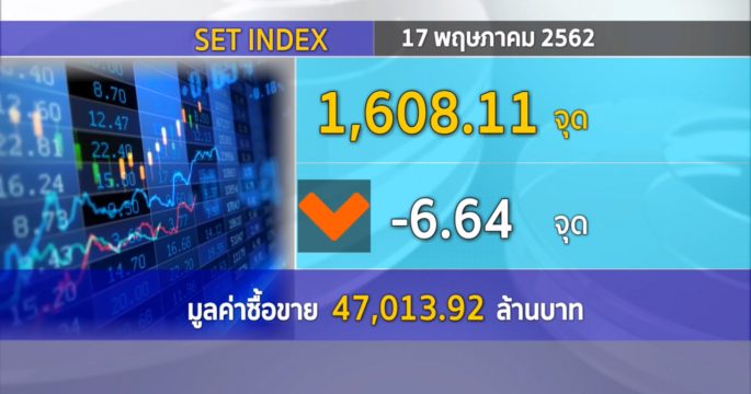 ตลาดหลักทรัพย์ปิดวันนี้ที่ระดับ 1,609.79 จุด ลดลง 17.12 จุด มูลค่าการซื้อขาย 47,047.13 ล้านบาท โดยการซื้อขายหุ้นวันนี้ ดัชนีหุ้นไทยเคลื่อนไหวในแดนลบตลอดทั้งวัน