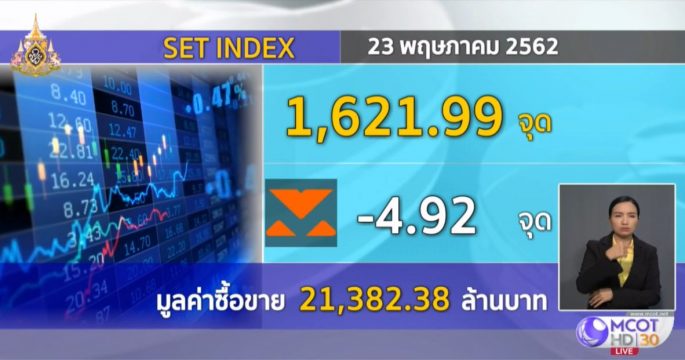 ดัชนีหุ้นไทย เช้านี้ลดลงเล็กน้อยตามตลาดต่างประเทศ ตลาดยังมีแรงขายทำกำไร และวิตกสงครามการค้ามีแนวโน้มยืดเยื้อโดยท่าทีของจีนก็แสดงให้เห็นว่าอาจจะมีการตอบโต้สหรัฐ ส่งผลให้นักลงทุนเลือกที่จะปรับพอร์ตก่อน ดัชนีช่วงเที่ยง ลดลง 4.92 จุด อยู่ที่ 1,621.99 จุด มูลค่าซื้อขาย 21,382.38 ล้านบาท