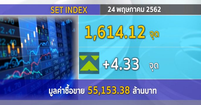 ตลาดหลักทรัพย์ปิดวันนี้ที่ระดับ 1,614.12 จุด เพิ่มขึ้น 4.33 จุด มูลค่าการซื้อขาย 55,153.38 ล้านบาท โดยการซื้อขายหุ้นวันนี้ ดัชนีหุ้นไทยเคลื่อนไหวทั้งในแดนบวก-ลบ