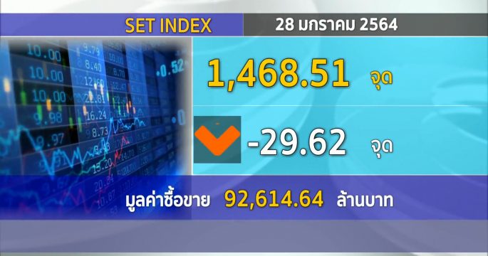 ตลาดหลักทรัพย์ปิดวันนี้ที่ระดับ 1,468.51 จุด ลดลง 29.62 จุด (-1.98%) มูลค่าการซื้อขาย 92,614.64 ล้านบาท การซื้อขายหุ้นวันนี้ ดัชนีหุ้นไทยเคลื่อนไหวในแดนลบตลอดทั้งวัน