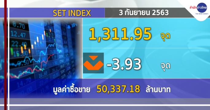 ดัชนีตลาดหลักทรัพย์ฯ ปิดวันนี้ (3 ก.ย.) ที่ระดับ 1,311.95 จุด ลดลง 3.93 จุด (0.30%) มูลค่าการซื้อขาย 50,337.18 ล้านบาท