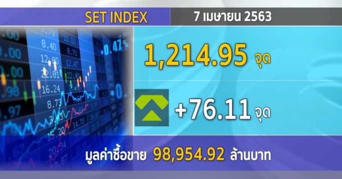 ดัชนีตลาดหลักทรัพย์ฯ ปิดวันนี้ (7 เม.ย.) ที่ระดับ 1,214.95 จุด เพิ่มขึ้น 76.11 จุด หรือ 6.68% มูลค่าการซื้อขาย 98,954.92 ล้านบาท ขานรับมาตรการเยียวยาโควิด-19