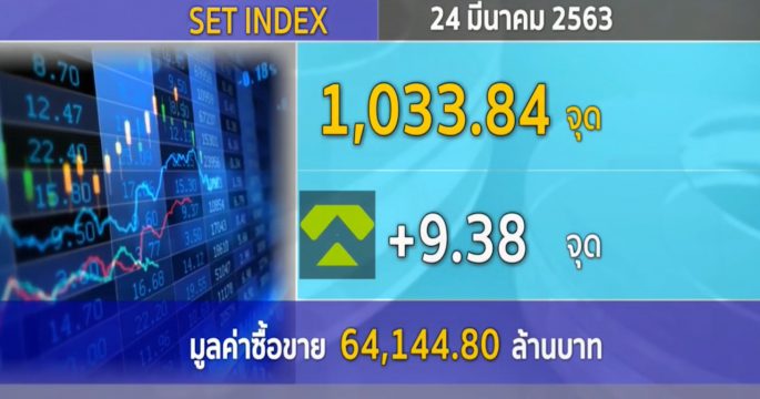 ดัชนีตลาดหลักทรัพย์ฯ ปิดวันนี้ (24 มี.ค.) ที่ระดับ 1,033.84 จุด เพิ่มขึ้น 9.38 จุด หรือ 0.92% มูลค่าการซื้อขาย 64,144.80 ล้านบาท รีบาวด์อ่อนกว่าภูมิภาค กังวลผู้ติดเชื้อในไทย