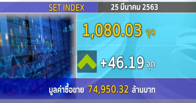 ดัชนีตลาดหลักทรัพย์ฯ ปิดวันนี้ (25 มี.ค.) ที่ระดับ 1,080.03 จุด เพิ่มขึ้น 46.19 จุด หรือ 4.47% มูลค่าการซื้อขาย 74,952.24 ล้านบาท หลังแบงก์ชาติคลอดเกณฑ์หนุนสภาพคล่อง คลายกังวลชัดเจน พ.ร.ก.ฉุกเฉิน