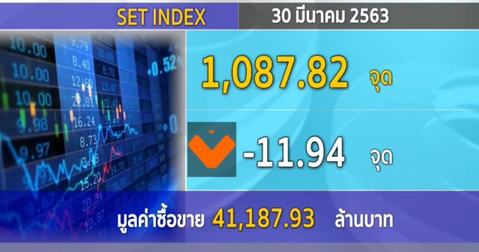 ดัชนีตลาดหลักทรัพย์ฯ ปิดวันนี้ (30 มี.ค.) ที่ระดับ 1,087.82 จุด ลดลง 11.94 จุด หรือ 1.09% มูลค่าการซื้อขาย 41,187.93 ล้านบาท โดยดัชนีเคลื่อนไหวแดนลบตลอดทั้งวัน ตามต่างประเทศ หลังยอดผู้ติดเชื้อโควิด-19 เพิ่ม กังวลสภาพคล่องธุรกิจชะงักจากพิษโควิด