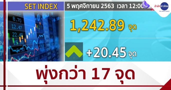 ตลาดหุ้นไทยภาคเช้าพุ่งกว่า 17 จุด ตามทิศทางนักลงทุนให้น้ำหนักกับการเลือกตั้งประธานาธิบดีสหรัฐ หลังนายโจ ไบเดน มีคะแนนนำนายโดนัล ทรัมป์