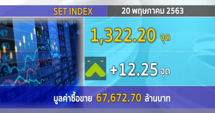 ดัชนีตลาดหลักทรัพย์ฯ ปิดวันนี้ (20 พ.ค.) ที่ระดับ 1,322.20 จุด เพิ่มขึ้น 12.25 จุด หรือ 0.94% มูลค่าการซื้อขาย 67,672.70 ล้านบาท ขานรับ กนง.ลดดอกเบี้ย หนุนกลุ่มไฟแนนซ์-อสังหาฯ ฟื้น