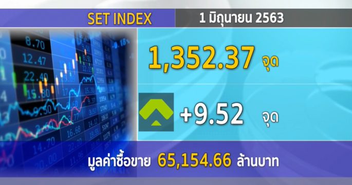 ดัชนีตลาดหลักทรัพย์ฯ ปิดวันนี้ (1 มิ.ย.) ที่ระดับ 1,352.37 จุด เพิ่มขึ้น 9.52 จุด หรือ 0.71% มูลค่าการซื้อขาย 65,154.66 ล้านบาท โดยดัชนีเคลื่อนไหวแดนบวกตลอดทั้งวัน หลังไร้ความรุนแรงในฮ่องกง ตัวเลขเศรษฐกิจจีนดีกว่าคาด