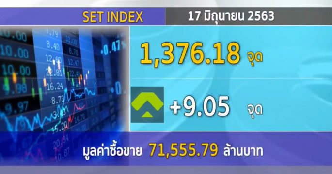 ดัชนีตลาดหลักทรัพย์ฯ ปิดวันนี้ (17 มิ.ย.) ที่ระดับ 1,376.18 จุด เพิ่มขึ้น 9.05 จุด หรือ 0.66% มูลค่าการซื้อขาย 71,555.79 ล้านบาท