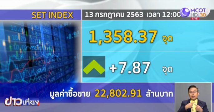 ตลาดหุ้นไทยในภาคเช้า ดัชนีปรับตัวขึ้นสดใสตามทิศทางตลาดหุ้นเอเชียที่ส่วนใหญ่ปรับขึ้น ขานรับข่าวความคืบหน้ายาต้านไวรัสโควิด-19 ส่งผลให้มีแรงซื้อเข้ามา ปิดตลาดภาคเช้า เพิ่มขึ้น 7.87 จุด ดัชนีอยู่ที่ 1,358.37 จุด มูลค่าซื้อขาย 22,802.91 ล้านบาท