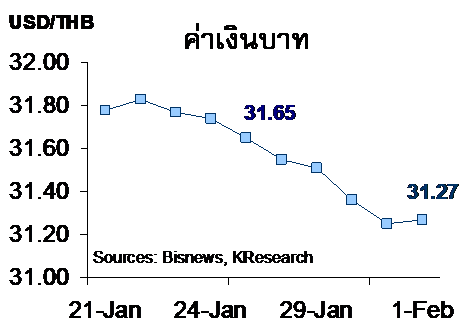 กรุงเทพฯ 2 ก.พ.-กสิกรไทยประเมินบาทมีโอกาสแข็งค่าอีกหลังสัปดาห์ที่แล้วแข็งค่าสุดในรอบ 9 เดือน ที่ 31.18 บาท/ดอลลาร์สหรัฐ