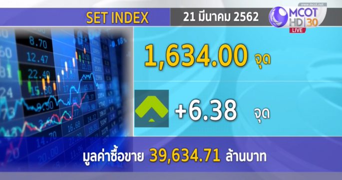 ดัชนีหุ้นไทยปิดวันนี้ที่ระดับ 1,634.00 จุด เพิ่มขึ้น 6.38 จุด มูลค่าการซื้อขาย 39,634.71 ล้านบาท