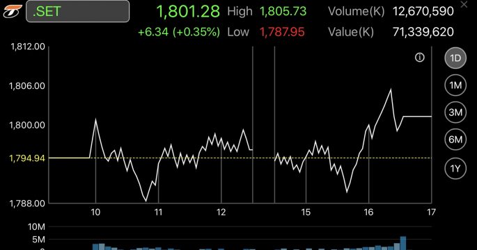 ตลาดหลักทรัพย์ปิดวันนี้ที่ระดับ 1,801.28 จุด เพิ่มขึ้น 6.34 จุด หรือร้อยละ0.35 มูลค่าการซื้อขาย 71,339.62 ล้านบาท