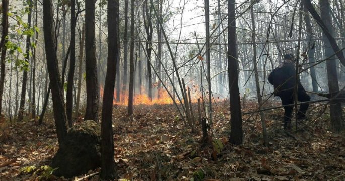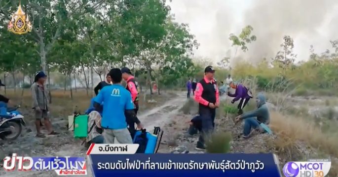 เจ้าหน้าที่เร่งเดินเท้าเข้าดับไฟป่าที่กำลังลุกไหม้ป่าสงวนทุ่งใหญ่ ไม่ให้ลุกลามเข้าพื้นที่เกษตร หลังเกิดไฟลุกไหม้พื้นที่ป่ารกทึบ รถดับเพลิงเข้าไปไม่ถึง