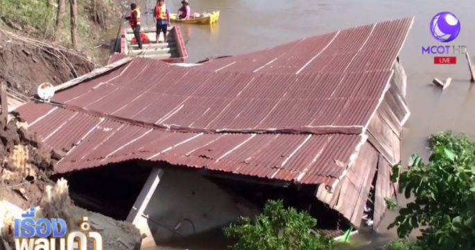 บ้านไม้ของลูกจ้างสำนักงานชลประทานเชียงใหม่ อ.วังทอง จ.พิษณุโลก ทรุดตัวพังลงไปในแม่น้ำวังทอง หลังน้ำกัดเซาะตลิ่งจนดินทรุด