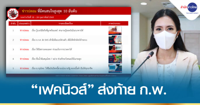 ดีอีเอส 8 ม.ค. – ดีอีเอส จับตาโอไมครอนดันข่าวปลอมสุขภาพพุ่งรอบใหม่ ซ้ำเติมสถานการณ์เฟคนิวส์กลุ่มข่าวสุขภาพ หลังศูนย์ต่อต้านข่าวปลอมเผยผลการมอนิเตอร์รอบ 7 วันที่ผ่านมา น.ส.นพวรรณ หัวใจมั่น โฆษกกระทรวงดิจิทัลเพื่อเศรษฐกิจและสังคมฝ่ายการเมือง (ดีอีเอส) กล่าวว่า สรุปผลการมอนิเตอร์ และรับแจ้งข่าวปลอมประจำสัปดาห์ ระหว่างวันที่ 31 ธ.ค. 64–6 ม.ค. 65 โดยศูนย์ต่อต้านข่าวปลอม พบข้อความที่เข้ามาจำนวน 11,468,179 ข้อความ โดยจากการคัดกรองมีข้อความที่ต้องดำเนินการตรวจสอบ (Verify) ทั้งสิ้น 203 ข้อความ รวมเรื่องที่ต้องดำเนินการตรวจสอบ 104 เรื่อง ในภาพรวมเรื่องที่ต้องดำเนินการตรวจสอบ 104 เรื่อง โดยกลุ่มข่าวเกี่ยวกับโยบายรัฐบาล/ข่าวสารทางราชการ และกลุ่มผลิตภัณฑ์สุขภาพ วัตถุอันตราย มีจำนวนกลุ่มละ 51 เรื่อง ครองสัดส่วนเกือบ 100% ตามด้วยกลุ่มภัยพิบัติ 2 เรื่อง สำหรับข่าวปลอมที่มีคนสนใจสูงสุด 3 อันดับแรก ได้แก่ อันดับ 1 […]