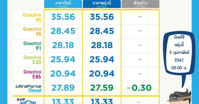 ปตท.-บางจากฯ แจ้งปรับลดราคาขายปลีกดีเซล 30 สต./ลิตร ส่วนกลุ่มเบนซิน-แก๊สโซฮอล์ คงเดิม มีผล 3 ก.พ.นี้