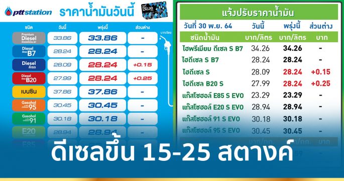 ผู้ค้าปรับราคาขายปลีกน้ำมันดีเซล B10 ขึ้น 0.15 บาทต่อลิตร เว้นดีเซล B20 ปรับขึ้น 0.25 บาทต่อลิตร ส่วนน้ำมันทุกชนิด คงเดิม มีผล 1 ธ.ค.64 เวลา 05.00 น. เป็นต้นไป