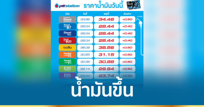PTT Station ปรับขึ้นราคาน้ำมันทุกชนิด 30-50 สตางค์/ลิตร มีผลวันที่ 24 ธ.ค.64 ตั้งแต่เวลา 05.00 น. เป็นต้นไป