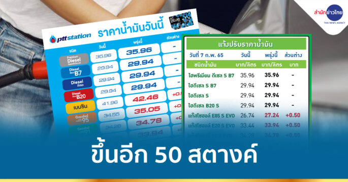 ผู้ค้าแจ้งปรับราคาน้ำมันทุกชนิด 50 สตางค์/ลิตร ส่วนกลุ่มดีเซลคงเดิม มีผลพรุ่งนี้ (8 ก.พ.65)