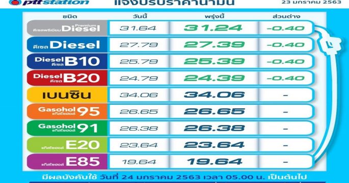 ปตท.-บางจากฯ ปรับลดราคาขายปลีกดีเซลทุกชนิด 40 สต./ลิตร ส่วนเบนซิน-แก๊สโซฮอล์คงเดิม มีผล 24 ม.ค.